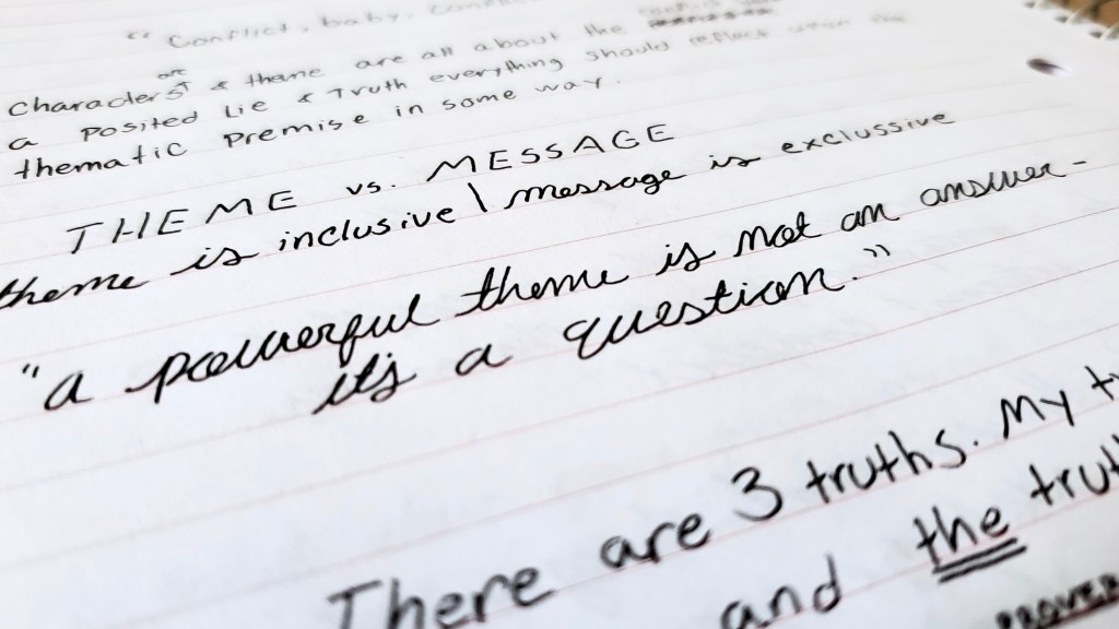1. Loved this!! Theme has always been a bit of a “vague notion” to me, but I remember when I read a first draft that I wrote that DIDN’T have a theme and WOW, it stuck out so much. I remember reading it and feeling like “wait, what’s the POINT of this story?” and I felt like a lot of the problem was the actual structure of the plot. Things just happened, but they didn’t have any MEANING to them. They didn’t grow the characters or advance a “theme”. If that makes sense.