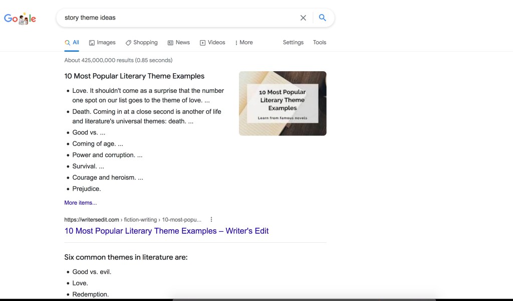 I had a few of the basics down. I had an intro, a few characters in mind, and a few names and places to begin with. But I did not yet have a theme. I was at a loss on how to condense this broad story idea into a single, cognizant message. So I did what any writer in doubt does, I went to google. I couldn’t really believe that I was scrolling through lists of generic themes to carve my story around. But to my surprise I found just what I was looking for. I found a theme that worked with my story and in fact, was exactly what I needed to fill in the gaps and join everything together seamlessly. Never had an outline come together so quickly or easily before.